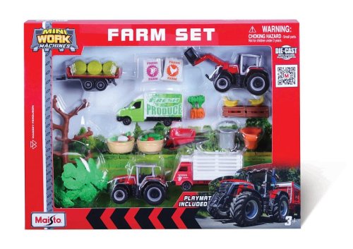 Mini Work Machines – Super farmářský set Massey Ferguson. Super set obsahuje: kovový model traktoru Massey Ferguson s plastovými detaily, přídavný traktor s buldozerem, dodávku, transportér, přívěs, strom, zeleninu a další příslušenství k sestavení vlastní farmy. Doplňky jsou vyrobeny z plastu. Součástí je také papírová hrací podložka o rozměru 29,7 x 21 cm. Model traktoru o velikosti 3'' (cca 7,5 cm) je vyroben z tlakově litého kovu. Rozměry balení: 23,2 x 20,49 x 4,45 cm. Věk: 3+