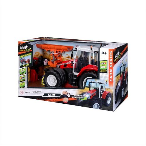 Traktor Massey Ferguson s radlicí a dálkovým ovládáním 2,4 GHz. Extrémní poměr otáčení, plně funkční ovládání, funkční světlomety. Pistolová rukojeť pro snadné ovládání. Přední a zadní konektory, řízení předních kol s detaily dezénu pneumatik. Přední radlice se dá natáčet ze strany na stranu. Měřítko 1:16. Vyžaduje 2 x AAA a 4 x AA baterie (nejsou součástí balení). Rozměr balení: 45x25x20cm. Věk: 3+