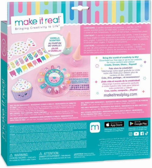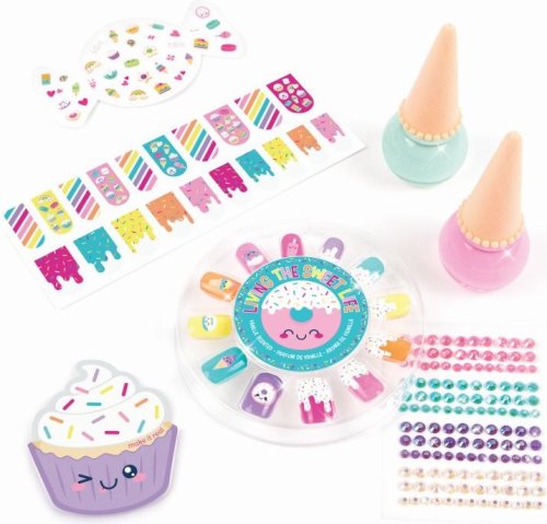 Odhal tajemství krásně nalakovaných nehtů! Laky na nehty se samolepkami, umělými nehty a ozdobnými kamínky, díky kterým budou vaše nehty ještě krásnější. Balení obsahuje: 2 laky na nehty ve tvaru zmrzliny s vůní vanilky, pilník na nehty, 12 ks umělých nehtů s vůní vanilky, 1 arch s drobnými nálepkami na nehty, 1 arch kamínků na nehty, 1 arch fólií na nehty, návod. Vhodné pro děti od 8 let.
