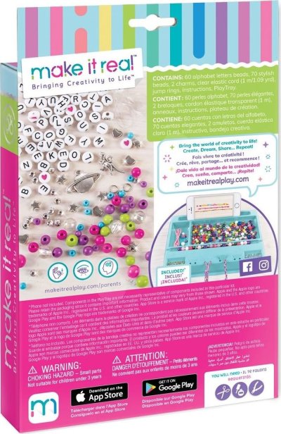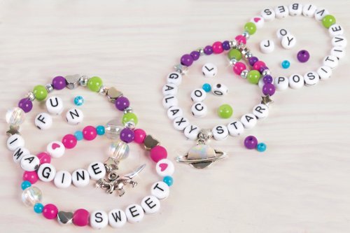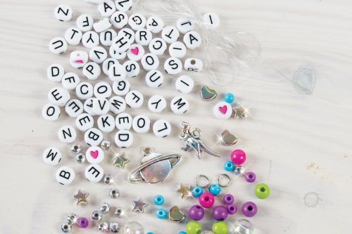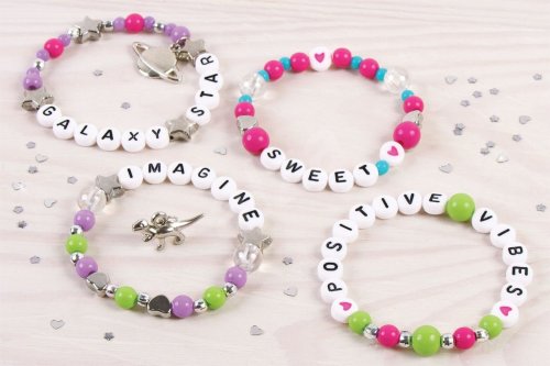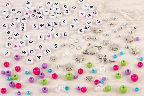 Výroba náramků, které se skládají z korálků a písmenek. Korálky se navlékají na vlasec, který je součástí. Součástí je mnoho barevných korálků, písmenek i doplňků. Baleno v krabici. Doporučený věk 8+