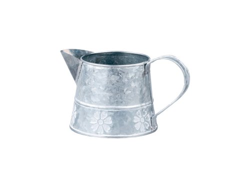 Plechová konev v šedé a bílé barvě s květinovou bordurou, skvělá pro květinové dekorace. Její rozměry jsou 185x115x105mm.