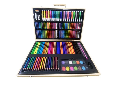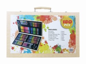 Uvnitř kufříku najdete celkem 180 kusů výtvarných potřeb, které zahrnují širokou škálu barevných nástrojů. Sada obsahuje 40 olejových pastelek, 40 barevných pastelek, 20 akvarelových fixů, 20 barevných tužek a 36 akvarelových per. Dále je zde 12 akvarelových barev, které lze použít s přiloženým štětcem a paletou pro míchání odstínů. Pro doplnění výbavy je součástí i tužka, guma, ořezávátko, pravítko, lepidlo a pět klipů, které pomohou udržet vytvořené výtvory pohromadě.