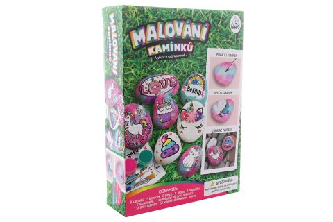 Malování kamínků. Sada obsahuje 8 kamínků, 5 barviček, 2 štětce, 52 lepících drahokamů, atd. Baleno v krabičce. Rozměry balení cca 18x25x5 cm. Věk 3+