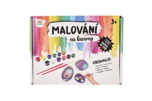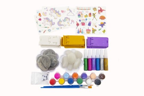 Zábavné zdobení kamenů, které zabaví najen děti, ale i dospělé. Pokud kamínky z balení dojdou v přírodě jich na vás čeká dost. Vynikající hračka pro rozvoj manuální zručnosti. Vše potřebné k výrobě najdete uvnitř balení. Balení obsahuje: 12 kamenů (z toho 6 svítících), 6x glitrové lepidlo, 12x barvy v uzavíratelných kelímkách, samolepky, palety na míchání barev, štětce, pohyblivé oči, stojánky pro malování kamenů. Rozměry balení 20 x 15 x 5 cm Vhodné pro děti od 3 let