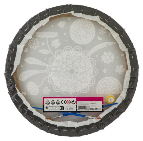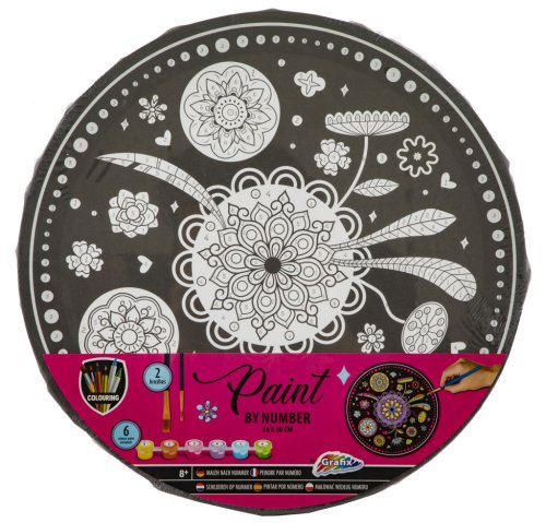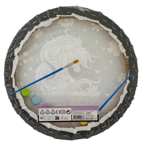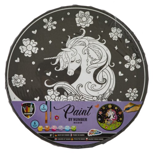 Malování podle čísel kruhový obrázek 30 cm. Balení obsahuje obrázek, 6 vodových barevk, dva štětce – plochý a kulatý. Dva druhy obrázků – mandala a jednorožec.