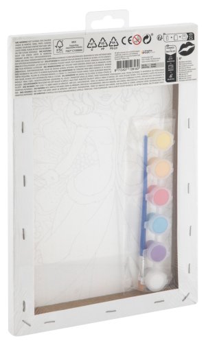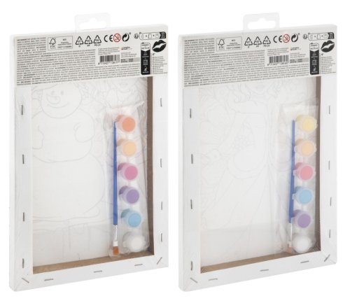 Malování podle čísel na plátno – dva různé druhy obrázků. Balení obsahuje předtištěný obrázek na plátně, vodové barvy – 6 ks a štetec. Vdelikost obrázku 29,7×19,5cm.