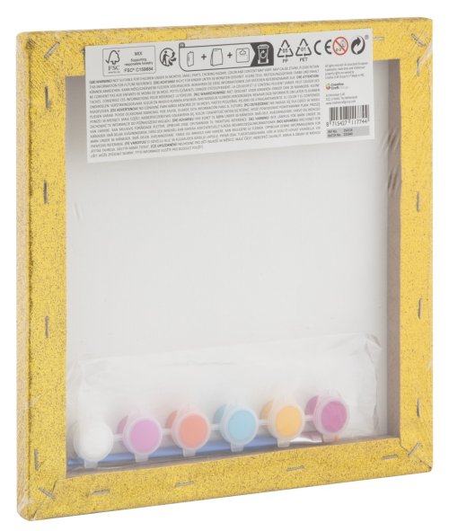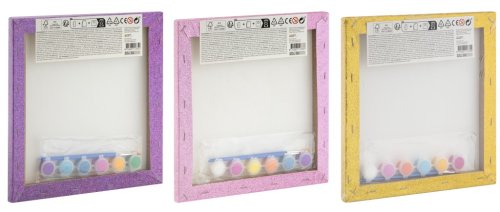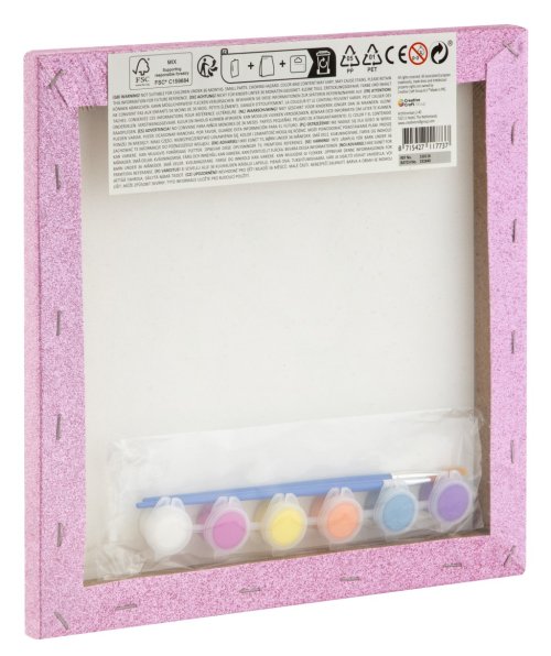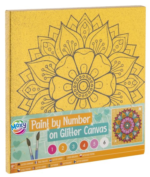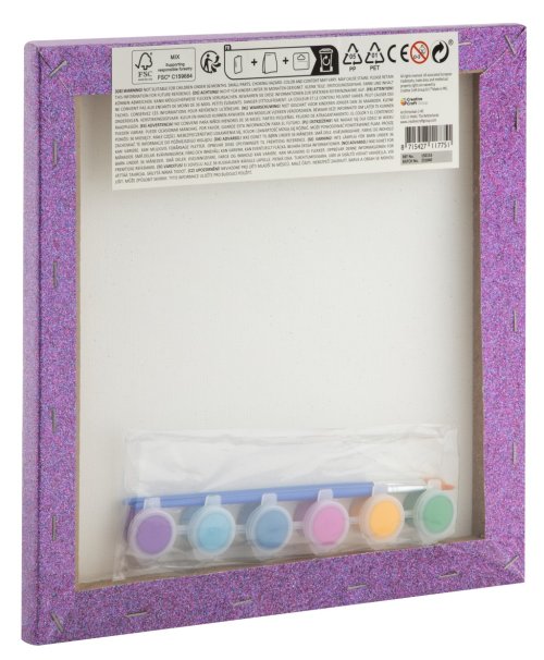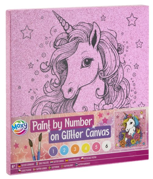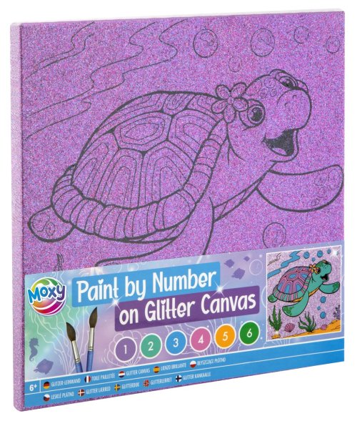 Malování podle čísel na třpytivé plátno – součástí balení třpytivé plátno s předtištěným obrázkem , 6 vodových barev a dva štětce. Tři různé druhy obrázků – mandala, jednorožec a želva,.