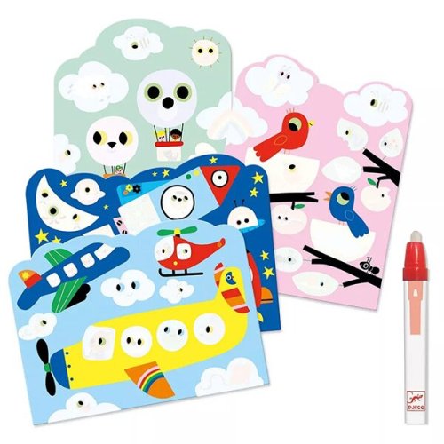 Nikdy nekončící zábava bude děti bavit a zaměstná je na dlouhých i krátkých cestách. Po vyschnutí se opět obrázek opět zahalí do bílé, neprůhledné barvy a děti mohou znovu, odkrývat. Sada je zabalena v praktickém obalu se zapínáním, aby se i na cestách nic neztratilo a děti mohly přes průhledný obal pozorovat postupně měnící se obrázek., Sada vodních omalovánek DJECO obsahuje:, * 4 obrázky, * magickou tužku, * hadřík
