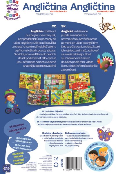 Anglické vzdělávací puzzle jsou navrženy tak, aby předškolákům pomohly při učení angličtiny. Děti se učí slovíčka z oblastí, o které mají největší zájem a přitom si užívají spoustu zábavy. Slovíčka jsou rozdělena do hracích desek podle témat, díky čemuž jsou informace na nich uvedené snadněji zapamatovatelné. Balení obsahuje: