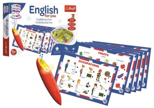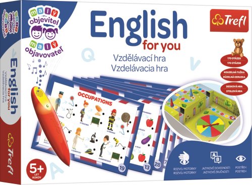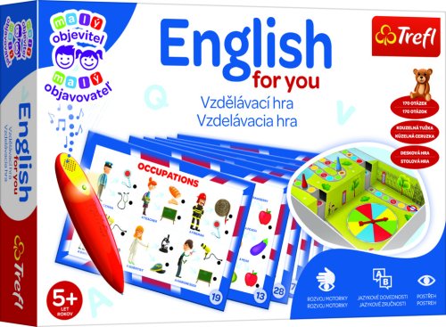 Veselá hra pro děti s kouzelným perem! Vzdělávací hra z edice her pro nejmenší Malý objevitel . Děti se učí základní anglickou slovní zásobu. Pomocí tématických karet se děti učí a upevňují si znalost jednotlivých slovíček. Prostřednictvím her a hádanek, které v této sadě najdete, mohou děti učinit první krůčky v učení cizího jazyka. Díky barevným ilustracím a zábavným úkolům si děti tuto hru oblíbí. Součástí balení je i magické pero, které po zvolení správné odpovědi vydá zvukový signál. Úkoly na hrací desce zahrnují různá témata z oblasti jazykového vzdělávání na předškolním a prvním školním stupni.: - základní slovní zásoba - jazykové hádanky - zábavné učení - logické úkoly Balení obsahuje baterií napájenou kouzelnou tužku, 16 oboustranných karet s úkoly, hrací deska na kartonové vložce v krabici, losovací šipka, 4 figurky a návod ke hře. Doporučeno pro děti od 5 let. Kolekce her Malý objevitel je určena pro děti ve věku od 2 do 6 let. Každá hra byla navržena tak, aby podporovala poznávací a intelektuální rozvoj dětí. Rozvíjí logicko-matematické myšlení, stimuluje komunikační schopnosti a obohacuje slovní zásobu. Cvičí vyzuálněpohybovou koordinaci, trénuje paměť a soustředění, a povzbuzuje představivost a kreativitu. Hry z kolekce Malý objevitel v sobě snoubí zábavu a učení a možnosti tvůrčího trávení volného času s dítětem.
