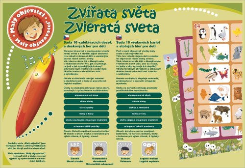 Veselá hra pro děti s kouzelným perem! Vzdělávací paměťová hra z edice her pro nejmenší Malý objevitel . Zvířata světa je veselá hra, která rozvíjí slovní zásobu u dětí a učí je základním počtům a rozeznávání tvarů a barev. Chceme tě pozvat k prozkoumání všech koutů světa a k hledání jejich obyvatel! Hra vzbudí zvědavost dětí a umožní jim poznat různé zvířecí druhy. Víš, která zvířata žijí v džungli nebo v hlubinách moře? Víš, jak se jmenují, co jedí a jak vypadají jejich domy? Díky barevným ilustracím a zábavným úkolům budou vaše děti hru hrát s potěšením. Při hře si dítě bude rozvíjet vnímání a představivost a bude si procvičovat logické myšlení. Součástí balení je i magické pero, které po zvolení správné odpovědi vydá zvukový signál. Úkoly na deskách pokrývají různé obory související s předškolním vzděláváním: - písmena a první slova - slovní úkoly - čísla a počty - barvy a tvary - úkoly související s logickým myšlením - schopnost třídit položky Balení obsahuje baterií napájenou kouzelnou tužku, 16 desek s úkoly, deska s kolečkem pro výběr otázek, 4 figurky a návod. Doporučeno pro děti od 4 let. Kolekce her Malý objevitel je určena pro děti ve věku od 2 do 6 let. Každá hra byla navržena tak, aby podporovala poznávací a intelektuální rozvoj dětí. Rozvíjí logicko-matematické myšlení, stimuluje komunikační schopnosti a obohacuje slovní zásobu. Cvičí vyzuálněpohybovou koordinaci, trénuje paměť a soustředění, a povzbuzuje představivost a kreativitu. Hry z kolekce Malý objevitel v sobě snoubí zábavu a učení a možnosti tvůrčího trávení volného času s dítětem.