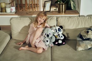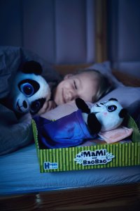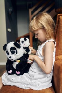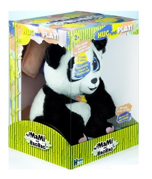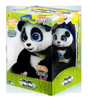 "Roztomilé interaktivní pandy Mami a BaoBao. 2 plyšové hračky (maminka a miminko)se zvuky a senzory (bez pohybu). Pandy vydávají 3 různé zvuky: Když je miminko položeno na záda maminky, začne hrát ukolébavka. Když se miminko přiblíží k obličeji maminky – ozve se zvuk polibku. Když se miminko přiblíží k jedné z rukou maminky (lechtání) - ozve se smích. Spodní část obalu je určena ke hraní - představuje postel. Balení také obsahuje dečku pro miminko. Doporučený věk: 18m+ Výška: maminka 29cm, miminko 20cm" Balení: 26x24x35cm