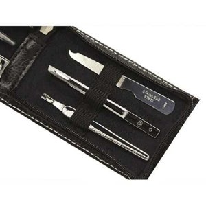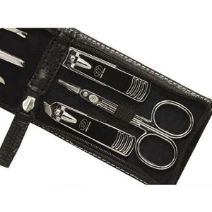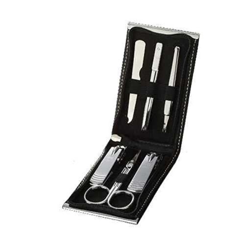 Černá minimalistická manikúrní sada obsahuje 6 základních nástrojů: dvoje kleštičky na nehty, pinzeta manikúrní zkosená, nůžky na kůži, pilník, zatlačovač kůžičky.