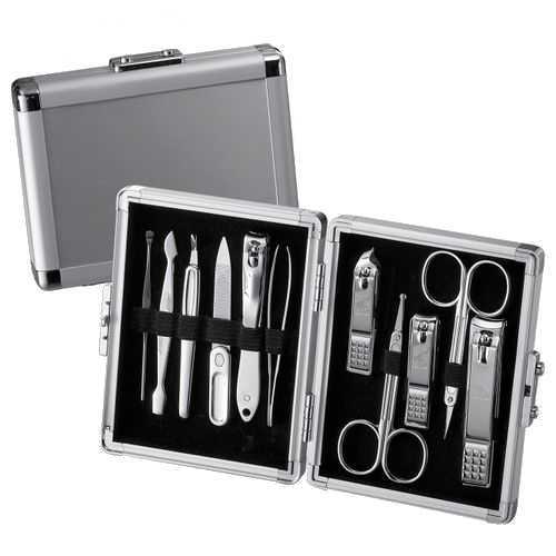 Velká manikúrní sada obsahuje 11 nástrojů pro kompletní manikúru. V sadě nalezenete: čtvery kleštičky na nehty, manikúrní zkosená pinzeta, nůžky na nehty, nůžky pro děti (kulaté špičky), pilník, manikúrní tyčinka, zatlačovač kůžičky, seřezávač kůžičky. Kvalitní pevné pouzdro v kovové imitaci. Precizní zpracování všech nástrojů ze speciální nerezové oceli.