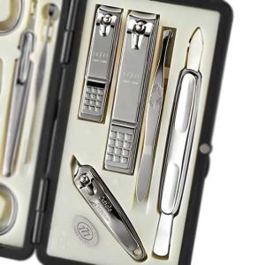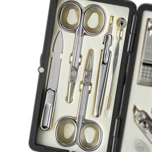 Manikúrní sada obsahuje 10 pozlacených nástrojů: troje kleště na nehty, pinzetu zkosenou, nůžky na nehty, nůžky pro děti, safírový pilník, oboustranný zatlačovač kůžičky, manikúrní tyčinku, seřezávač kůžičky.