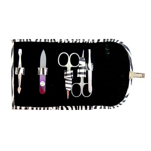 Skvěle zpracovaná 5 dílná luxusní sada na manikúru, jejíž součástí jsou nůžky na nehty, nůžky na kůži, pinzeta manikúrní rovná, skleněný oboustranný barevný pilníček a oboustranný nástroj (skalpel se zatlačovačem kůžičky). Nástroje jsou uloženy v pevném kvalitním koženkovém pouzdru s moderním atraktivním vzorem a jednoduchým zavíráním na klip. Precizní zpracování všech nástrojů zajistí maximální spokojenost při používání.