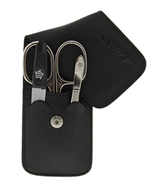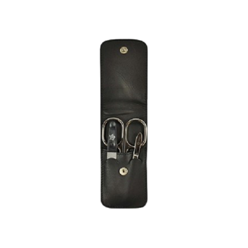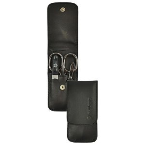 Cestovní manikúrová sada Pfeilring Solingen na úpravu nehtů. Manikúra je vyrobena z pravé kůže a má zapínání na skrytý patent. Nůžky jsou kované z uhlíkové oceli s lesklou niklovou povrchovou úpravou (proti reznutí).