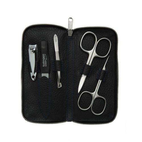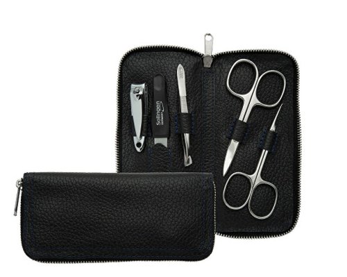 Pánská manikúrová sada v koženém pouzdře pro úpravu nehtů. Nástroje jsou vyrobeny z niklu.