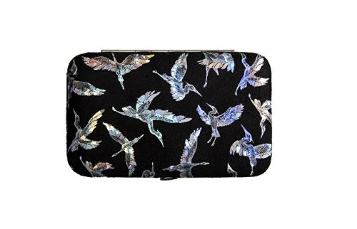 6 dílná sada manikúry v krásném pouzdře z černého semiše zdobeného stříbrnými ptáčky. Díky kompaktnímu tvaru pouzdra můžete brát manikúru všude s sebou.