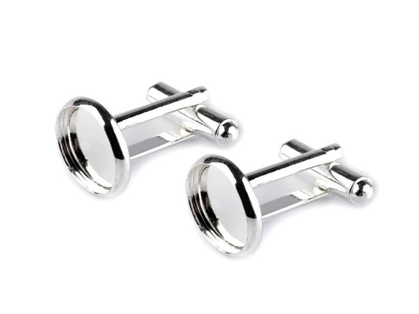 Manžetové knoflíky s lůžkem. Do lůžka můžete vlepit kabošon. Nebo lůžko zalijte křišťálovou pryskyřicí. Stěny lůžka jsou mírně vypouklé, pryskyřice bude skvěle držet. Do pryskyřice můžete zalít např. třpytky či drobné korálky. Nebo do lůžka vlepte obrázek a na něj následně pryskyřici nalijte. Lůžko je hluboké 1,7 mm. Vnitřní průměr má 12 mm, vnější 14 mm. Stěny mističky se lehce zavírají dovnitř.