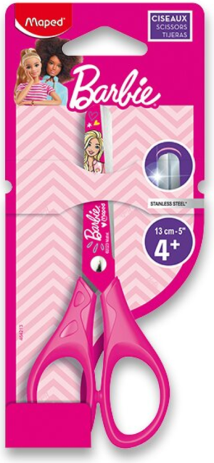 atraktivní design s motivem oblíbené panenky Barbie, zaoblené špičky, dekorované čepele z broušené nerezové oceli, 3D ergonomická rukojeť přizpůsobená dětským ručkám.