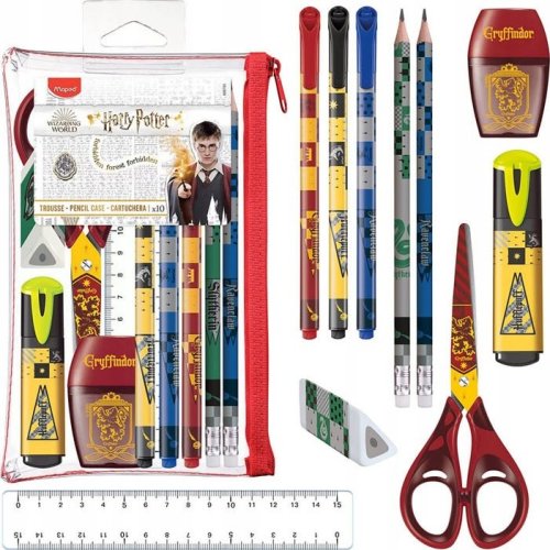 Sada psacích potřeb v průhledném pouzdru s motivem Harryho Pottera, která obsahuje všechny kouzelnické nezbytnosti do školy nebo na doma.