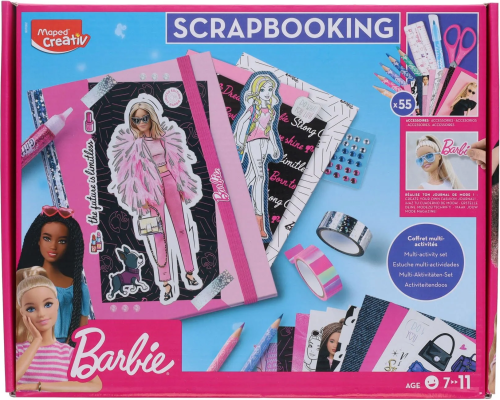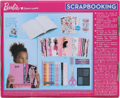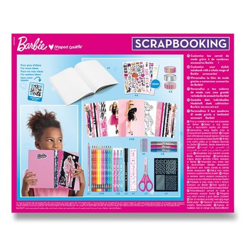 Sada obsahuje:, * zápisník, * 200 samolepicích etiket s obrázky módních doplňků, * 25 archů s motivy Barbie, * sadu flitrů, * nůžky, * pravítko, * 10 pastelek, * 3 fixy, * 3 fashion samolepicí pásky, * šablonu