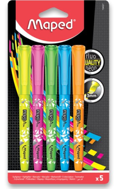 Balení obsahuje: 5 neonových zvýrazňovačů (žlutá, růžová, zelená, modrá a oranžová barva)