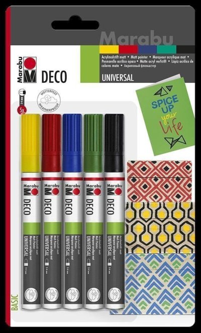 Marabu akrylový popisovač 5 x 2-4 mmAkrylová malba bez štětců!Díky této značce barvy jsou štětce zastaralé. Inovativní špička hroty poskytují kontrolované a bohaté nanášení barvy, jako by to bylo kouzlem a bez časově náročného sbírání více barvy. Malování na plátna nebo velké vzory na hliněné květináče, dřevěné rámy nebo jednoduše na papír. Budete to milovat. Vysoká úroveň pokrytí umožňuje malování a psaní i na tmavých površích. Děti také rádi používají tento popisovač, protože je bez zápachu a rychle schne. Na vodní bázi. Sada 5 obsahuje barvy Sunshine Yellow, Cherry, Mint, Lapis a Black.Matný akrylový značkovač na vodní bázi pro školy, řemesla a volný časVelmi dobré krytí, rychlé schnutíSvětlo rychlý a odolný vůči povětrnostním vlivůmK lakování všech hladkých a porézních povrchů, jako je papír, dřevo, terakota, kov, sádra a plasty.Efektivní psaní kaligrafickým perem - Během psaní vždy udržujte hrot kaligrafie ve stejné poloze, abyste získali efektivnější písmo.Rovnoměrný tok barvy - Během lakování je nutné opakovat čerpání, aby byl zajištěn rovnoměrný tok barvy. Uzavřete víčko, zatřepejte značkovačem a pumpujte pouze 2 až 3krát. Nikdy nenechávejte značkovač otevřený příliš dlouho, protože by to mohlo špičku vyschnout. Skladujte vodorovně!Zavírání víček - Po použití uzavřete víčko barvy Marabu Painter „cvaknutím“.Postupujte podle těchto pokynů, abyste si své značkovače užívali co nejdéle: 1. Nikdy nenechávejte značkovače otevřené příliš dlouho, a to ani během malování, protože by to mohlo hrot vyschnout! 2. Odstraňte přebytečnou barvu, vždy vyčistěte značkovače a pevně uzavřete víčko! 3. Značky vždy skladujte vodorovně.Čištění malířských předmětů - Před lakováním musí být všechny předměty zbaveny prachu a mastnoty.Pro aktivaci ventilového systému zatřepejte značkovačem s nasazeným víčkem (míchací koule musí být jasně slyšitelná). Poté odstraňte víčko a několikrát zatlačte špičkou dolů na neutrální povrch, dokud nebude viditelný inkoust. Poznámka: 1. Tenký hrot 0,8 mm musí být čerpán pouze dvakrát. 2. Metalické a třpytivé barvy je třeba třepat déle, protože pigmenty jsou těžší. 3. Při čerpání malířů Marabu Painters postupujte pomalu, protože příliš mnoho čerpání může vést k nadměrnému vypouštění inkoustu.Vyschlé nebo špinavé špičky barvy - Jednoduše odstraňte zaschlé nebo špinavé špičky od Painter, Porcelain Painter, Glas Painter, Textil Painter plus nebo Textil Glitter Painter ze značkovače a očistěte je vodou. Pokud je to nutné, namočte na chvíli do teplé vody. Pro zvýšení odolnosti Deco a Brilliant Painter proti povětrnostním vlivům nechte design zaschnout po dobu nejméně 30 minut. Poté proveďte lak jedním z aqua laků (bezbarvý lak, matný lak nebo lak se saténovým povrchem).Obsah: 5 x Deco Painter 2-4 mm (Sunshine yellow 220, Cherry 125, Mint 153, Lapis 143, Black 073)