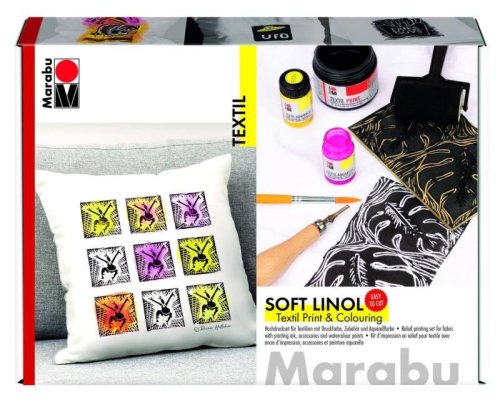 Marabu barva na potisk textilu s linorytem sada. U reliéfního tisku jsou tiskové oblasti vyvýšeny, což znamená, že jsou vytištěny pouze vyvýšené čáry, žlaby nebo povrchy tiskové desky. Měkká tisková deska se velmi snadno používá. Jedná se o přímý tiskový proces, tj. Tisková deska přenáší inkoust přímo na látku. Proto musí být motivem jeho zrcadlový obraz na tiskové desce. Průhledné akvarely se ředí vodou a nanáší se na látku mokrým štětcem. Na vodní bázi, odolný vůči slinám, omyvatelný na 40 ° C a měkký na dotek. Pro světlé barvy bez povrchových úprav a kondicionérů (max. 20% syntetických vláken). Po vysušení zafixujte v troubě (150 ° C / 8 minut) nebo žehlete 3 minuty bez páry. Před použitím barvy promíchejte a nástroje po použití omyjte vodou. Obsah: 1 x potisk textilu 100 ml (saze 974), 2 x textil Aquarelle 15 ml (citron 020, purpurová 014), 1 x pěnový váleček (60 mm), 1 x štětec Marabu Universal kulatá velikost 12, 1 x řezačka s 2 čepele (velikost 2 a 5), ??1 x měkká tisková deska (gumový řezací blok Factis (155 x 90 x 7 mm)), 1 x brožura