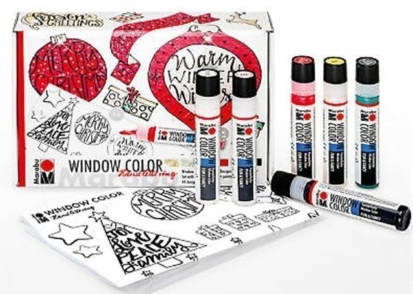 Sada slupovacích barev ke zdobení hladkých povrchů. Sada barev oken Handlettering Xmas• odnímatelná průhledná barva• Na vodní bázi• vysoký lesk• zářivé barvy• Měkká lakovací láhev s jemnou špičkou zaručuje příjemnou práci• Velmi snadné použití: malování, odlepování, hotovo!Sada obsahuje:- 6 x Window Color zábava a fantazie 25 ml v barvách: třpytivé zlato, třpytivé stříbro, jedle zelená, rubínově červená, bílá, kontura černá- 1 x DIN A3 omalovánka se 44 motivy (zimní ruční nápisy a krásné vánoční motivy)- 1 x malířská fólie A4Příklady použití:- na zdobení oken, zrcadel, skla, porcelánu, dlaždic a mnoha dalších hladkých povrchů- vykouzlete skvělé motivy ručního písma na oknech, lahvích, sklenicích a jiných hladkých površích