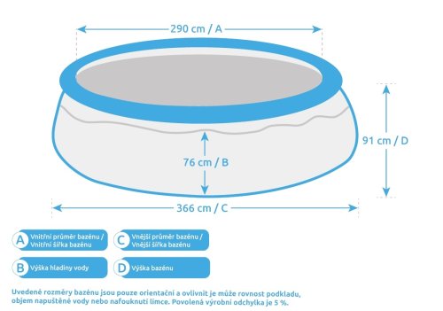 Rozměry bazénu: průměr 3,66 m, výška 0,91 m