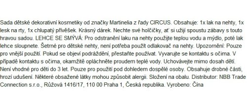 MARTINELIA Circus Sada lak na nehty a lesk na rty s klíčenkou. Obsahuje: 1x lak na nehty, 1x lesk na rty, 1x chlupatý přívěšek. Pro odstranění laku na nehty použijte teplou vodu a mýdlo, poté lak lehce sloupnete. Šetrné pro dětské nehty, není potřeba použít odlakovač na nehty.