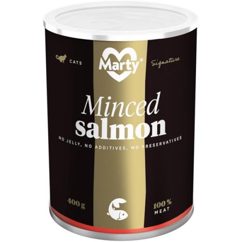 MARTY DeLuxe konzerva - drcený losos: Jednosložková krmná surovina pro kočky ve formě drceného lososa nabízí kočce možnost stravy z čistého a 100% rybího masa bez jakéhokoliv zatížení přidanými konzervanty nebo jinými přísadami. Konzerva pro kočky ze stoprocentního masa prémiové kvality je ideálním krmivem pro kočku neboť obsahuje pouze maso bez jakýchkoliv aditiv nebo konzervantů. MARTY konzerva pro kočky ze 100% masa se vyznačuje stoprocentní živočišnou složkou bez obsahu rýže, sóji, brambor, ale ani přidaných konzervantů. Obsah konzervy je složen ze 100 % masa nejvyšší kvality. Toto krmivo tak respektuje přírodu a vašeho masožravého miláčka umožňuje krmit opravdu masem! Složení: Ryby (losos). Analytické složky: Hrubý protein (120 g/kg), vlhkost 72 %. Doporučené dávkování: Na hmotnost kočky 3 kg je 100 g krmiva denně.
