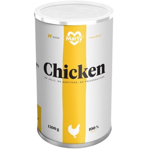 MARTY konzerva pro psy ze 100% masa - kuřecí. Nabízí psovi možnost stravy z čistého a stoprocentního masa bez zatížení konzervanty a dochucovacími či barvícími přísadami. Krmivo neobsahuje sóju, mouku, rýži ani jiné přísady. Konzerva pro psy ze stoprocentního mletého masa s mírným obsahem vnitřností je ideálním krmivem pro psa neboť obsahuje pouze maso bez jakýchkoliv aditiv nebo konzervantů. MARTY konzerva pro psy ze 100% masa se vyznačuje stoprocentní živočišnou složkou bez obsahu rýže, sóji, brambor, ale ani přidaných konzervantů. Obsah konzervy je složen ze 100 % mletého masa obsahující dominantně složku masa uvedeného v názvu. Toto krmivo tak respektuje přírodu a Vašeho masožravého miláčka umožňuje krmit opravdu masem! Složení: Vedlejší produkty živočišného původu (kuřecí maso min. 60 %, hovězí maso, vepřové maso). Analytické složky: Na 1 kg: bílkoviny (130 g), tuky (60 g), vláknina (5 g), popelovina (25 g), vlhkost 75 %, vysoký přirozený obsah vitamínů A, D, E a aminokyselin lysin, metholin a cystin. Dávkování: Doporučené krmné dávky na den: hmotnost psa 5 kg = 200 g krmiva, hmotnost psa 10 kg = 400 g krmiva, hmotnost psa 20 kg = 600 g krmiva, hmotnost psa 30 kg = 800 g krmiva.