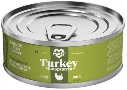 Konzerva MARTY Monoprotein krůtí maso nabízí Vašemu psovi možnost stravy z čistého masa bez jakéhokoliv zatížení přidanými konzervanty nebo jinými přísadami. Přítomnost čistě krůtího masa neutralizuje riziko alergické reakce na případné jiné druhy masa. MARTY konzervy pro psy ze 100% masa se vyznačují stoprocentní živočišnou složkou bez obsahu rýže, sóji, brambor a přidaných konzervantů. Obsah konzervy je složen ze 100 % mletého masa obsahující pouze maso a vedlejší živočišné produkty ze zvířete uvedeného na obalu. Toto krmivo tak respektuje přírodu a vašeho masožravého miláčka umožňuje krmit opravdu masem, navíc i v případě, že je pes alergický na určitý druh masa! Před výrobou těchto krmiv je navíc čištěno veškeré vybavení tak, aby nebyly přítomny ani stopy jiných druhů masa. Složení: Krůtí maso, změkčené krůtí kosti. Analytické složky: Hrubý protein (130 g/kg), hrubý tuk (65 g/kg), hrubý popel (45 g/kg), hrubá vláknina (0 g/kg), vlhkost 75 %. Krmný návod: Podávejte při pokojové teplotě, zajistěte přístup k dostatku pitné vody. Po otevření skladujte v ledničce. Doporučené krmné dávky na den: Na hmotnost psa 5 kg 200 g krmiva.