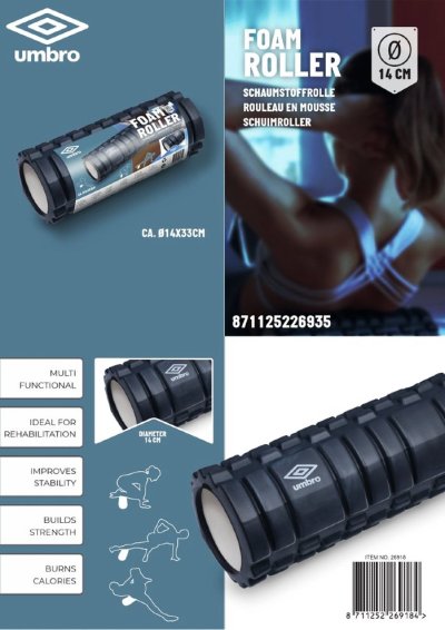 Dopřejte svým svalům rychlou regeneraci, hlubokou relaxaci a účinný automasážní efekt s masážním válcem Foam Roller značky UMBRO. Tento odolný a ergonomický roller o rozměrech 33 × 14 cm je ideální pomůcka pro regeneraci po tréninku, pro rehabilitaci i zlepšení flexibility.