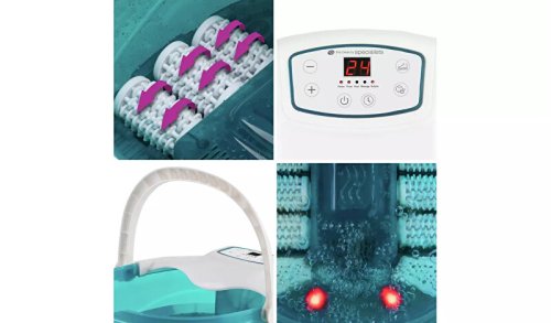 Oživte unavené nohy s luxusní masážní vanou, která obsahuje vše, co potřebujete pro zklidnění chodidel. Šest motorizovaných masážních válečků stimuluje akupresurní body a uklidňující bublinková lázeň jemně hněte nohy. Lze jednoduše přidat bylinky/květy nebo esenciální oleje.