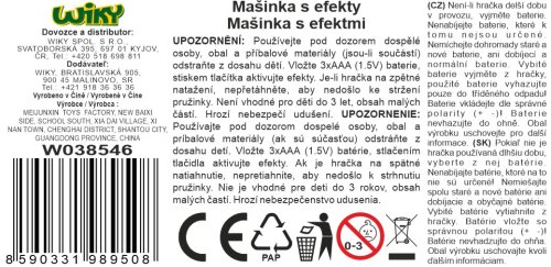 Mašinka s efekty. Rozměry 23,5x12x14 cm. Na zpětné natažení. Světelné a zvukové efekty tlačítky na mašince. 3xAAA baterie nejsou součástí.