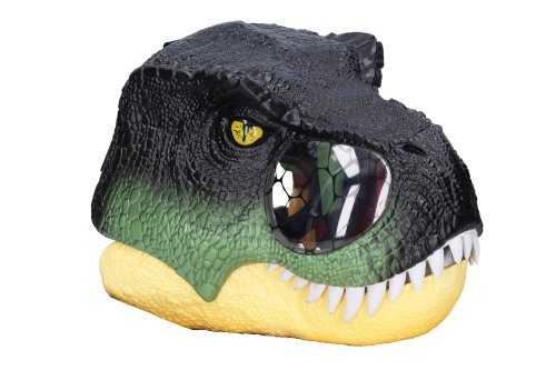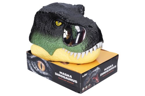 Maska na hlavu dinosaurus s efekty. Rozměry 28x22x21,5 cm. Pohybem hlavy se otevírá čelist, svítí oči a aktivuje se dinosauří řev. Světelné a zvukové efekty. 3xAG13 baterie součástí.