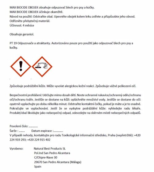 Složení: Geraniol 13 % (Geraniol má preventivní a léčebný účinek na vnější parazity, klíšťata a blechy), LDPE 97 %.