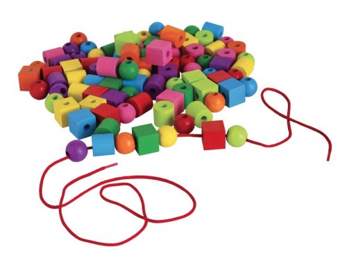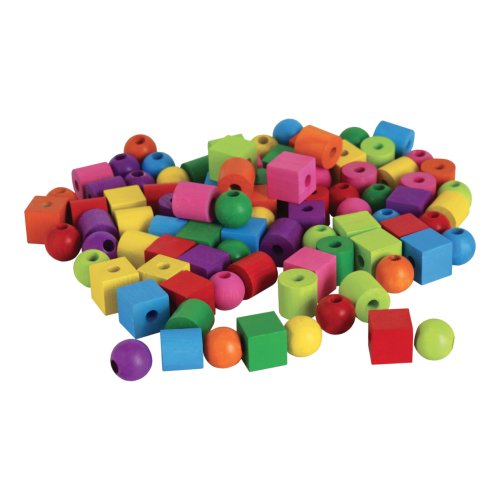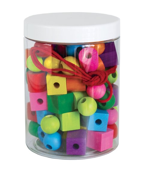 Dřevěné maxiperle různých tvarů o průměru 20 mm se šňůrkou na navlékání v plastovém kyblíku.