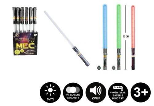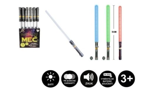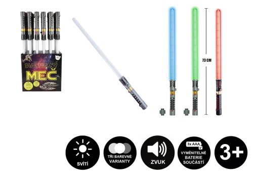 Meč při pohybu mění zvuk, při zasažení cíle vydává zvuk a svítí. Vybrat si můžete ze 3 barevných variant. Na baterie 3x AAA, které jsou součástí hračky. Rozměr meče: 73 cm Vhodné pro děti od 3 let