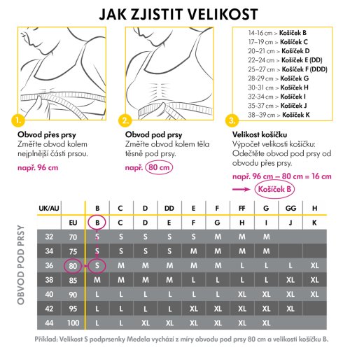 Každá žena je jiná a společnost Medela tuto rozmanitost uznává. V případě, že nemůžete najít svou velikost v naší velikostní tabulce, doporučujeme vyzkoušet velikost podprsenek Medela, která je nejblíže vašim mírám.