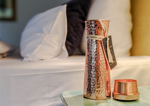 Luxusní karafa z mědi, o obsahu 1200 ml. Použití pouze pro čistou, neperlivou vodu, bez jakýchkoliv přísad.