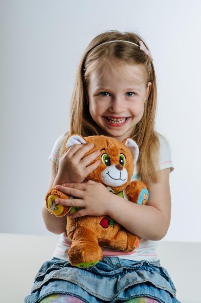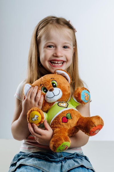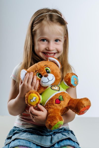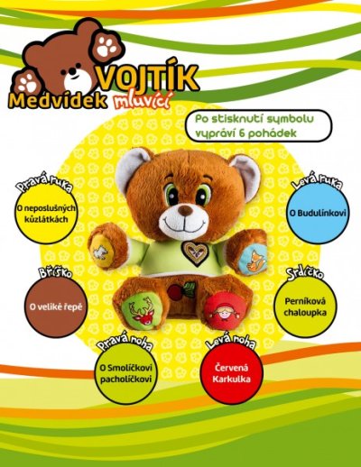 Veselý medvídek Vojtík vypráví dětem šest známých, českých pohádek - O neposlušných kůzlátkách, O veliké řepě, O Smolíčkovi pacholíčkovi, Červená Karkulka, Perníková Chaloupka, O Budulínkovi. Stačí zmáčknout symbol a poslouchat. Velikost medvídka 30 cm, v krabici 25 x 30 cm, na baterie. Vhodný od 12 měsíců.