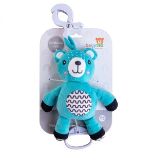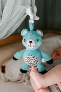Roztomilý plyšový medvídek s natahovacím hracím strojkem je krásná a uklidňující hračka pro miminka již od narození. Po zatáhnutí za táhlo začne medvídek přehrávat jemnou ukolébavku, která pomáhá děťátku zklidnit se a pohodlně usnout. Díky praktickému závěsnému klipu je možné medvídka snadno připevnit na postýlku, kočárek, autosedačku nebo hrací hrazdičku, takže bude mazlivý kamarád vždy po ruce – ať už doma nebo na cestách. Medvídek je vyroben z měkkého hebkého plyše, který je příjemný na dotek a ideální pro první kontakt dětí s různými texturami. Kontrastní vzory na bříšku navíc podporují vizuální vnímání miminek. Hračka je certifikována v ČR, a tedy plně bezpečná pro novorozence.