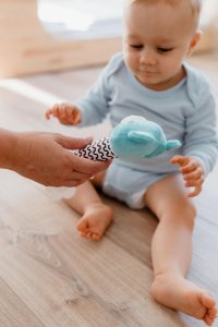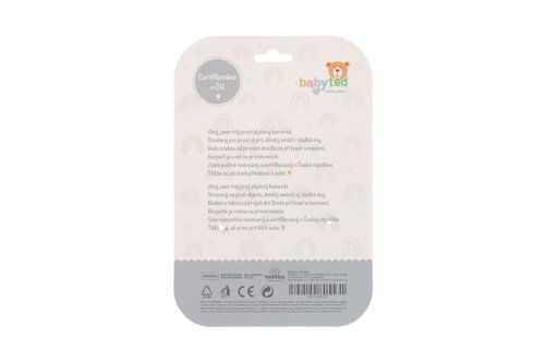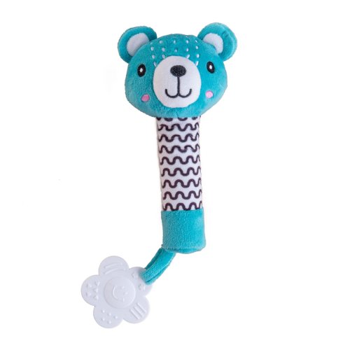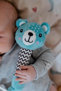 Roztomilý plyšový medvídek je ideální první hračka pro miminka již od narození. Díky svému dlouhému, měkkému tělíčku se skvěle drží v malých ručičkách a při stisku vydává jemný pískací zvuk, který podporuje sluchové vnímání a přirozeně zaujme pozornost miminka. Na konci držátka je umístěno měkké plastové kousátko ve tvaru kytičky, které pomáhá ulevit citlivým dásním při růstu prvních zoubků. Kontrastní vzory na tělíčku podporují vizuální vnímání a rozvoj zraku. Medvídek je vyroben z hebkého, bezpečného plyše, který je vhodný pro nejmenší děti. Hračka je navíc certifikována v ČR, takže splňuje přísné bezpečnostní normy.