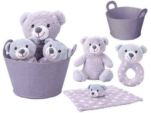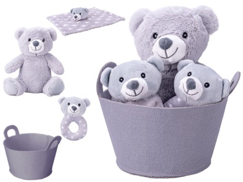 Medvídek plyšový 20 cm šedý sedící s chrastítkem 13 cm a usínáčkem v košíku