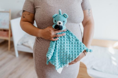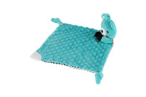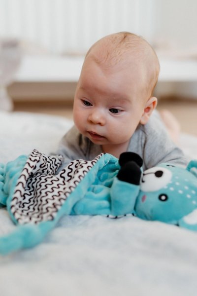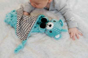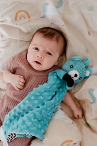 Heboučký plyšový usínáček s hlavou roztomilého medvídka je ideálním parťákem pro miminka již od narození. Vyrobený z měkkého minky materiálu s 3D puntíky přináší pocit bezpečí, komfortu a pomáhá uklidňovat při usínání. Uvnitř medvídka je ukryté jemné chrastítko, které podporuje sluchový rozvoj dítěte a přirozeně upoutává pozornost. Na jednom z rohů je umístěné měkké silikonové kousátko, které uleví citlivým dásním při prořezávání zoubků. Uzlíky na rozích jsou snadno uchopitelné i pro malé ručičky a podporují hmatovou stimulaci. Certifikováno v ČR, splňuje přísné bezpečnostní standardy pro novorozence.